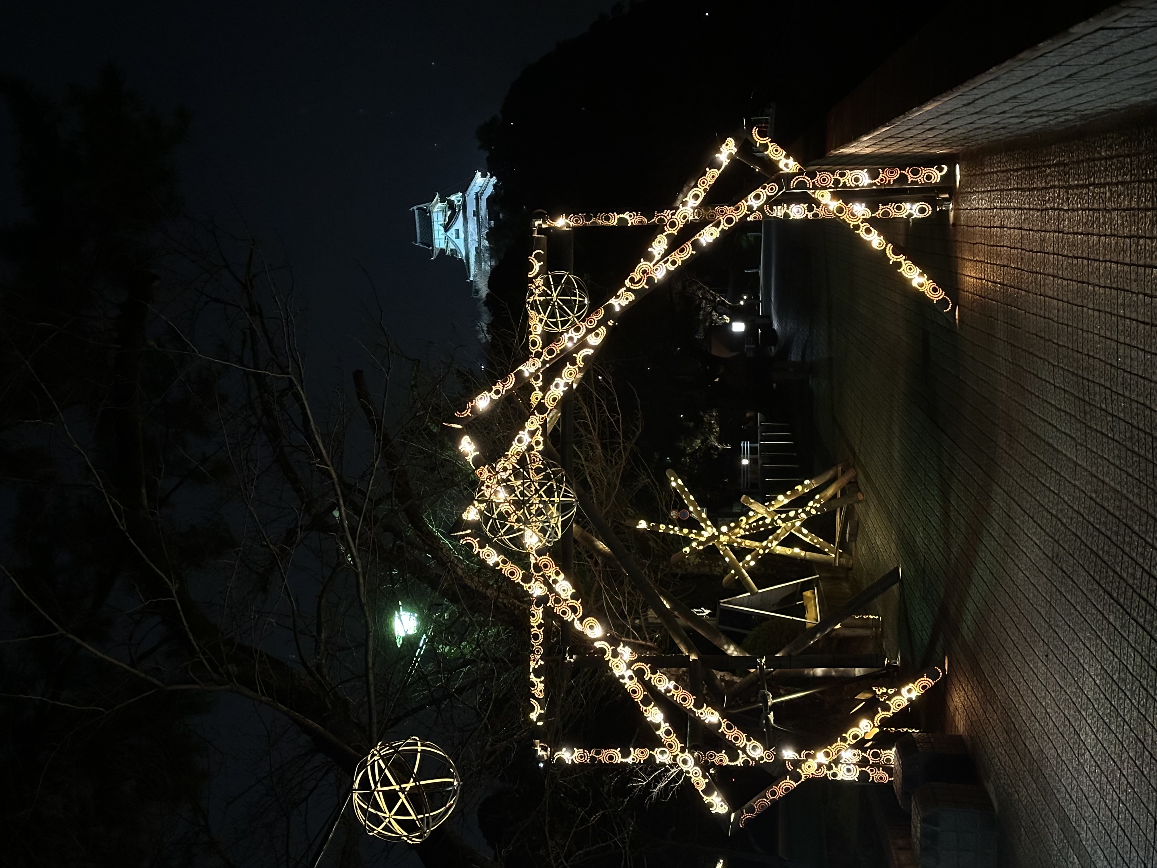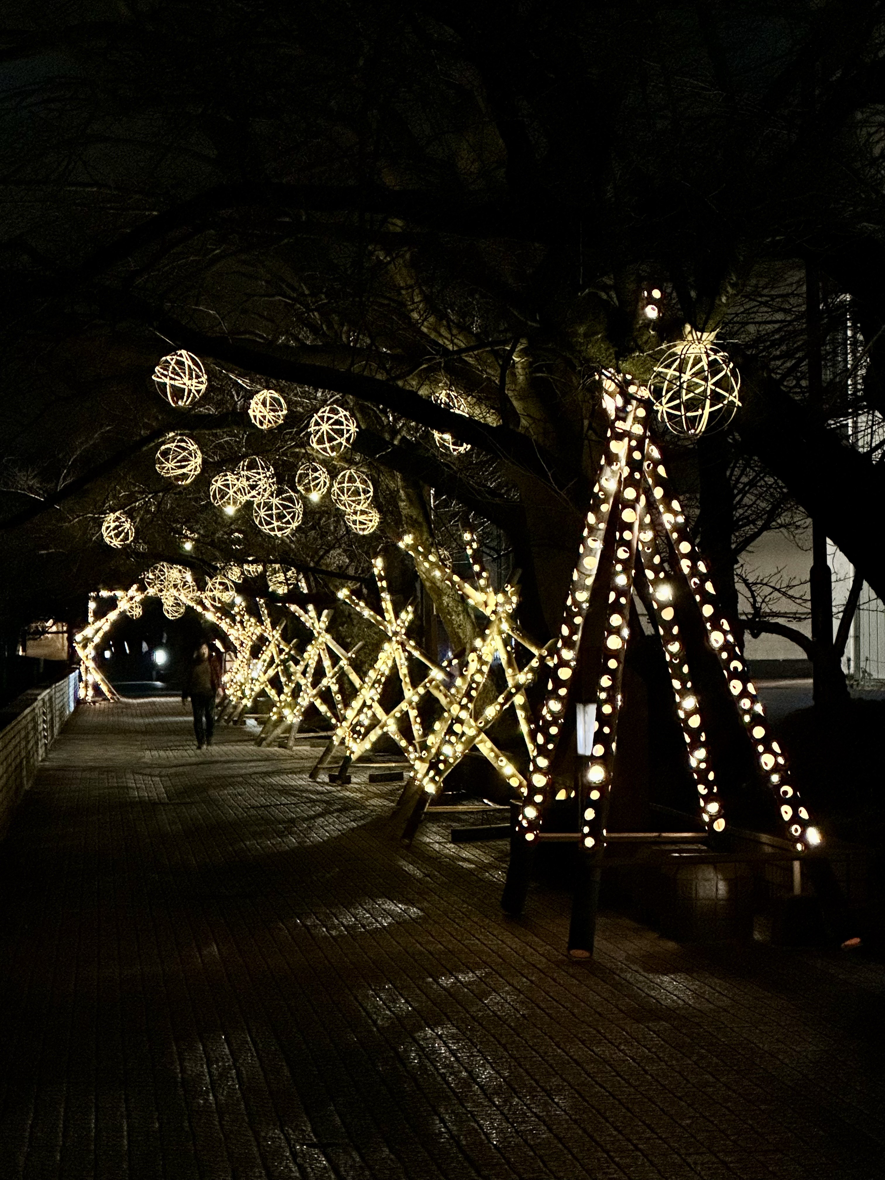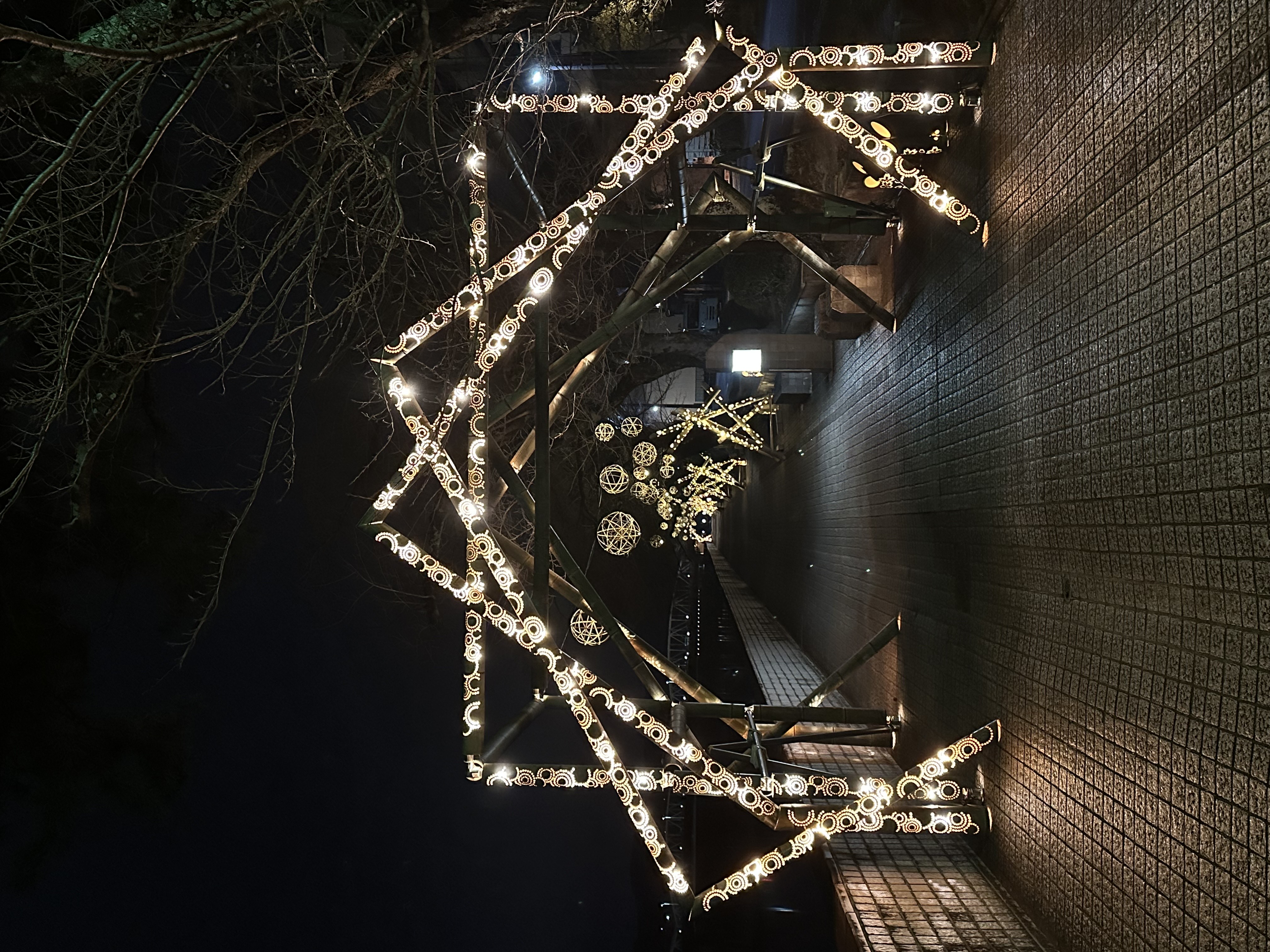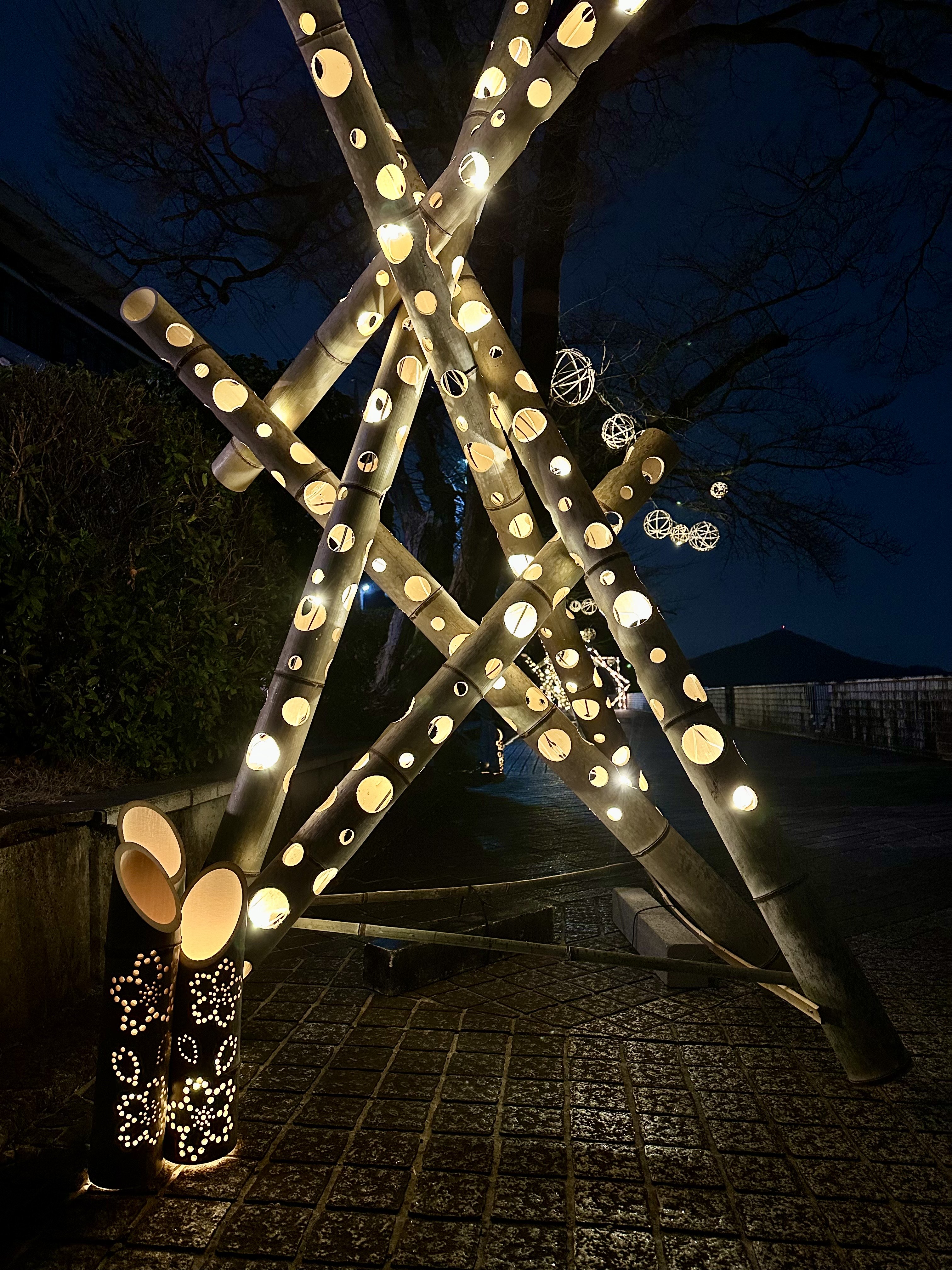 游月庵からお城に向かって歩いて、お城の前を右折れてお城沿いに下って木曽川河畔にでると、ご覧の通り! やさしい竹あかりがお出迎えしてくれます。
