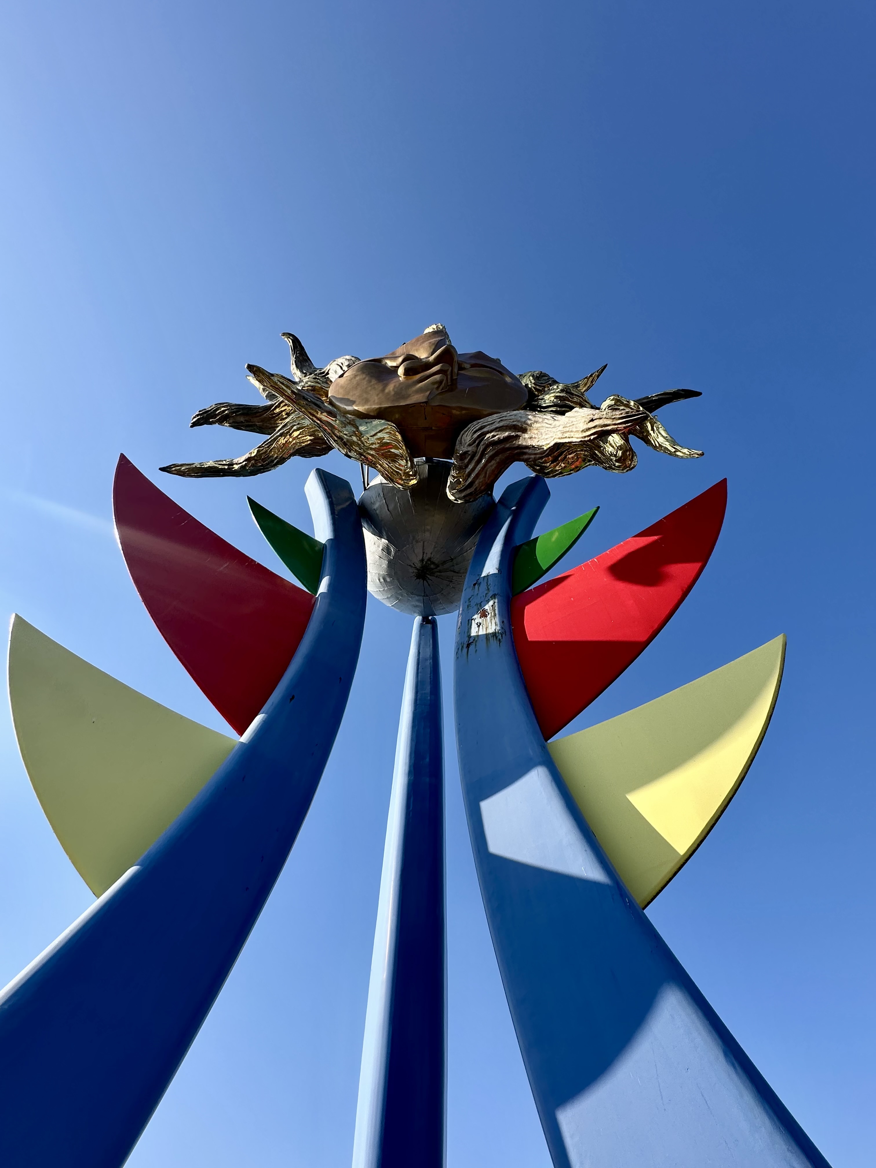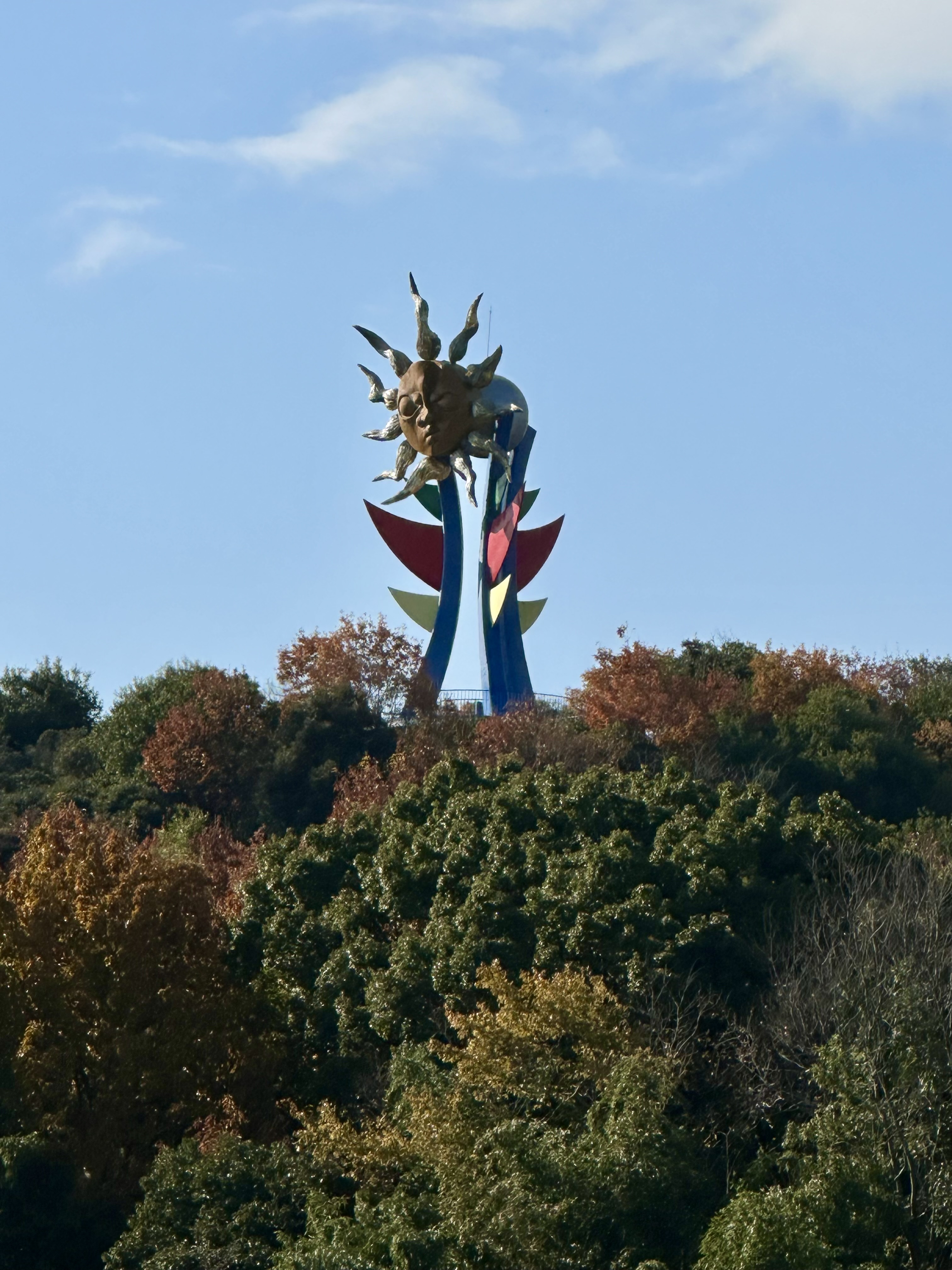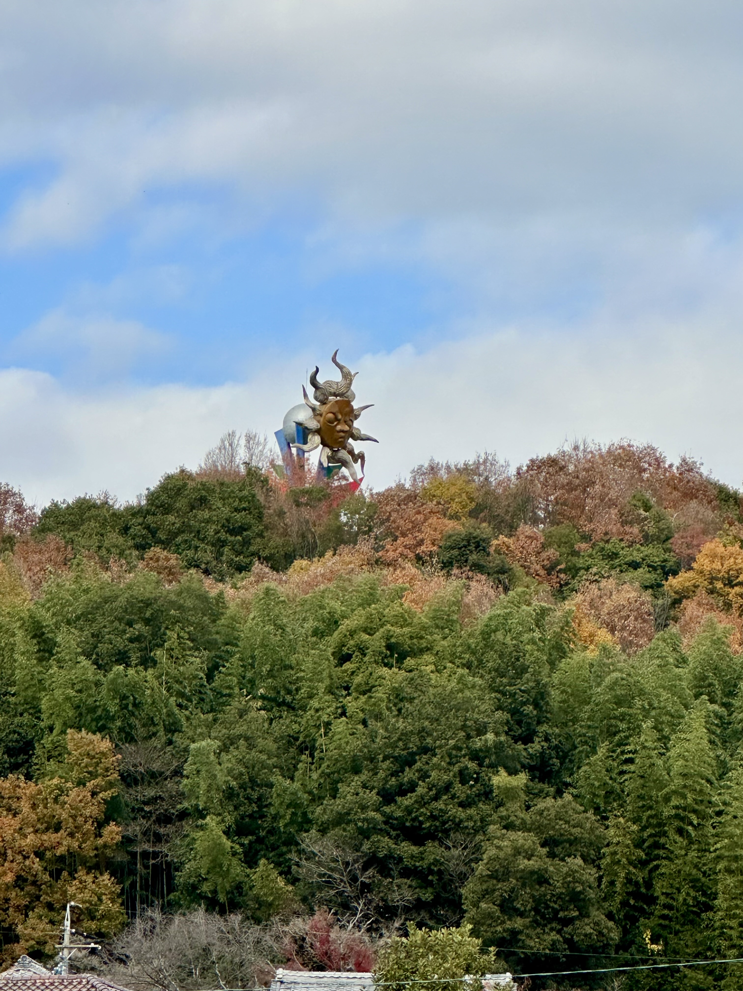 これは、EXPO’70大阪万博の「太陽の塔」に先立ち、1969年の3月に芸術家岡本太郎さんにより制作されました。当時アジア初の国際博覧会EXPO’70が開催されるということで、それを盛り上げるように日本各地で万博の開催にちなんだプレイベントが企画されてたようです。この地では名古屋鉄道(略称:名鉄)さんが犬山ラインパーク(現:日本モンキーパーク)でのプレイベントとして岡本太郎さんにオブジェの製作を依頼してできたというものとのことです。若い太陽の塔の顔は、太陽の塔がもつ3つの顔(現在、過去、未来を表す)のうち正面に描かれている顔で、そうしたことから、太陽の塔の兄弟ともいわれています。