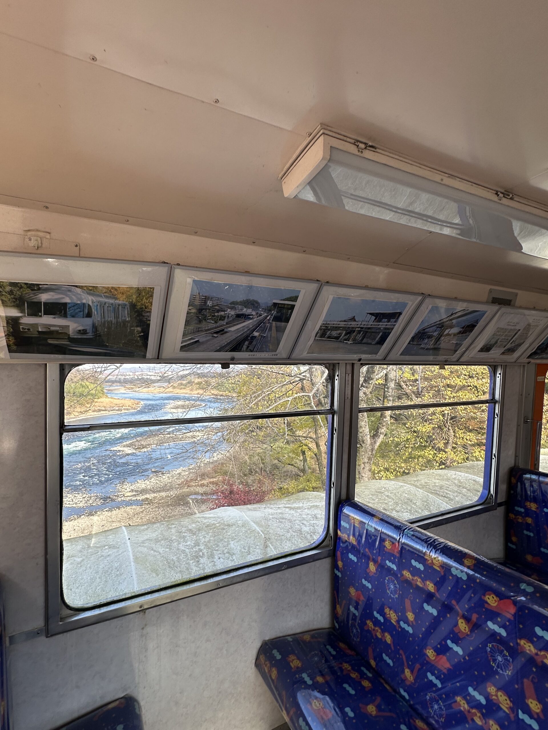 なんと犬山駅から北東へ10kmの岐阜県可児市にある日帰り温泉施設「湯の華アイランド」の駐車場に展望台として利用されています。なぜ、展望台なのか?と思うかもしれませんが、こちらの場所が可児川と木曽川が合流する景勝地になっており、ちょっとした見晴らし台のような扱いで車両が展示保存されています。外装は湯の華アイランド仕様に再塗装されていますが、社内は当時の状態が保存されていて、運転台に座ることもできますし、関連する資料のパネル展示などもあり、り、車両の中に入って往時をしのぶことができます。