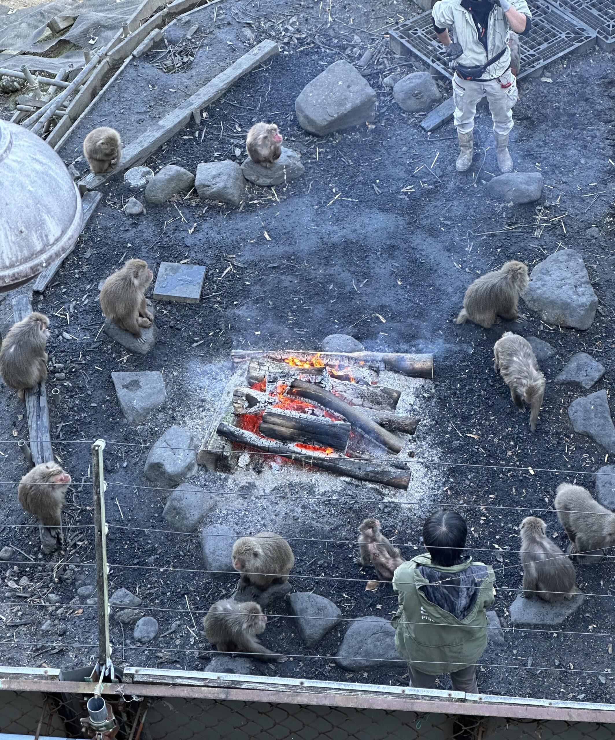 本来火を怖がるはずのサルが、1959年の伊勢湾台風後に職員が始めたたき火がきっかけで集まるようになり、60年以上続く習慣となったものだそうです。
